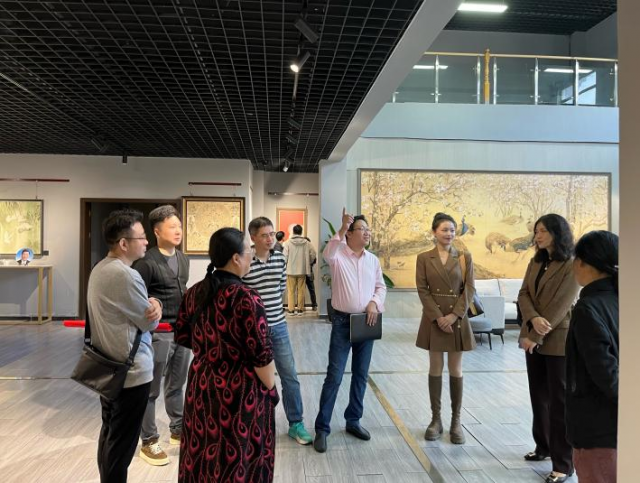 调研组首站来到了位于名坊园的邓利工作室。在邓利的引导下,一行人参观了其最新的陶瓷艺术创作,并观摩了现代彩绘技术与传统瓷板画相结合的艺术作品。邓利介绍了他的创新理念和在传统工艺上的继承与突破,给调研团队留下了深刻印象。