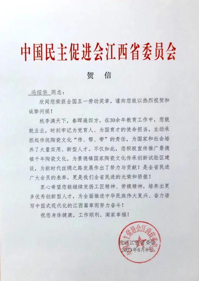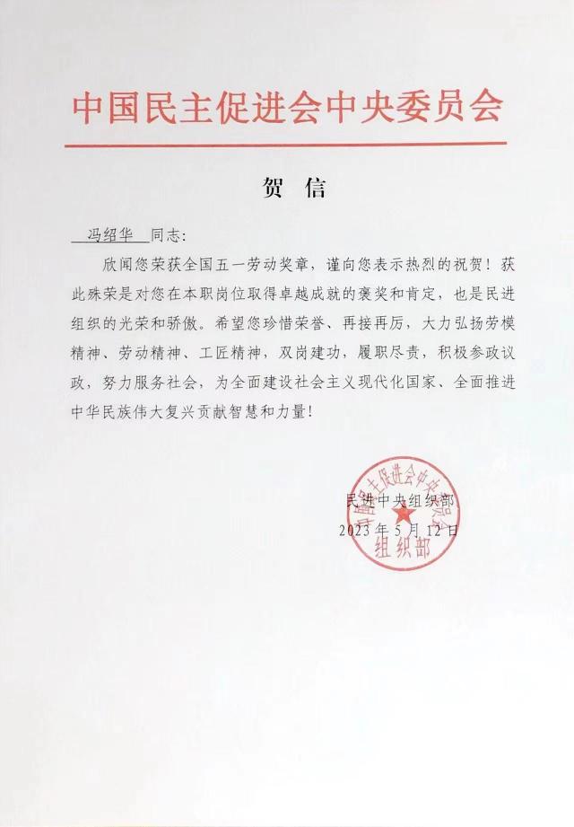 卢天锡表示,全国五一劳动奖章是一份闪亮的荣誉,是全省民进的光荣和骄傲,获此殊荣离不开党委的关心和帮助,离不开在本职岗位的刻苦钻研,离不开家人的默默支持。冯绍华教授爱岗敬业、拼搏奋斗、守正创新的精神,值得全省民进会员学习。卢天锡希望,通过凝聚奋进的榜样力量,营造比学赶超的良好氛围,激励引领全省会员学先进、赶先进、当先进,团结奋斗,共同推动新时代民进事业新发展。也希望冯绍华教授珍惜荣誉,立足本职,做好示范,再接再厉,继续发扬劳模精神、劳动精神、工匠精神,双岗建功、履职尽责,为全面推进中华民族伟大复兴、奋力谱写中国式现代化的江西篇章而努力奋斗。