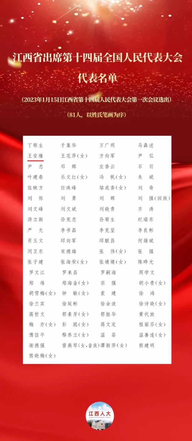 (本网讯:景苑轩)1月15日上午,省十四届人大一次会议举行第三次全体会议,大会选举产生了81名江西省出席第十四届全国人民代表大会代表。民盟景德镇学院支部盟员王安维教授当选第十四届全国人大代表。